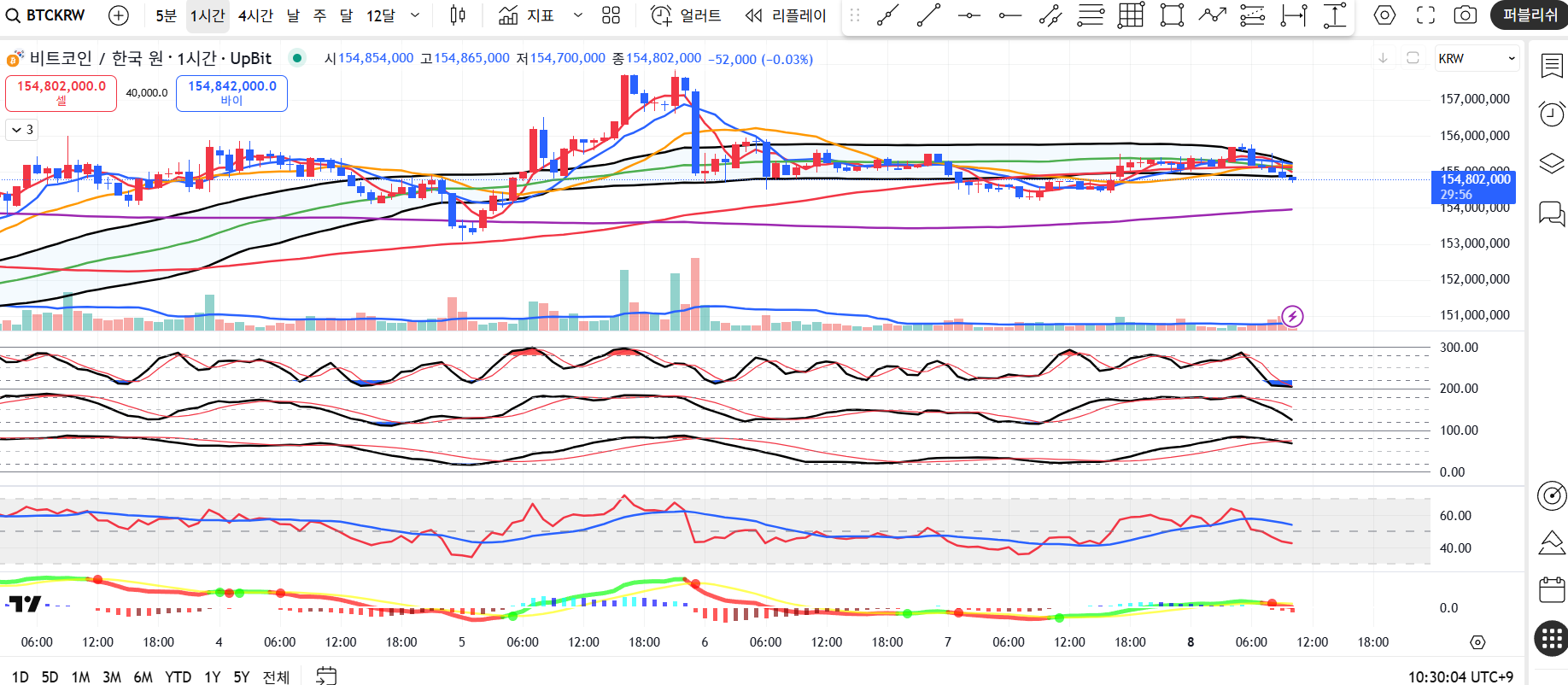 오늘의 뉴스미국 정부 셧다운 우려미국 의회가 예산안 합의에 실패하면서 셧다운 가능성이 시장에 부담을 주고 있습니다. 그럼에도 불구하고 10월 금리인하에 대한 기대감으로 위험자산의 강한 반등세를 보이며 비트코인도 좋은 흐름을 보여주고 있습니다.⏰ 1시간봉(1H) 차트 분석현재가 : 168,231,000원범위 : 저가 167,768,000원 ~ 고가 168,232,000원RSI : 과매수권에 근접, 단기 조정 가능성 시사MACD : 골든크로스 유지, 0선 위에서 강세 흐름스토캐스틱 : 단기 하락 전환 신호, 단기 과열 해소 필요이동평균선(MA) : 5일선과 20일선이 상방 정렬, 단기 추세 강세볼린저밴드 : 상단을 돌파한 뒤 밴드 상단 부근에서 조정 중 → 단기 과매수 신호📌 요약: 1H 차트는 단기 과열..