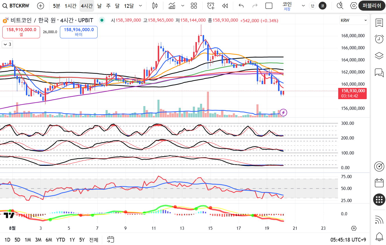 - 단기(1H 기준): 과매도 구간 진입으로 소규모 반등 가능, 그러나 저항 돌파 힘은 부족. → 단타 진입 시 1억 5,800만 원 지지 확인 후 짧게 접근.