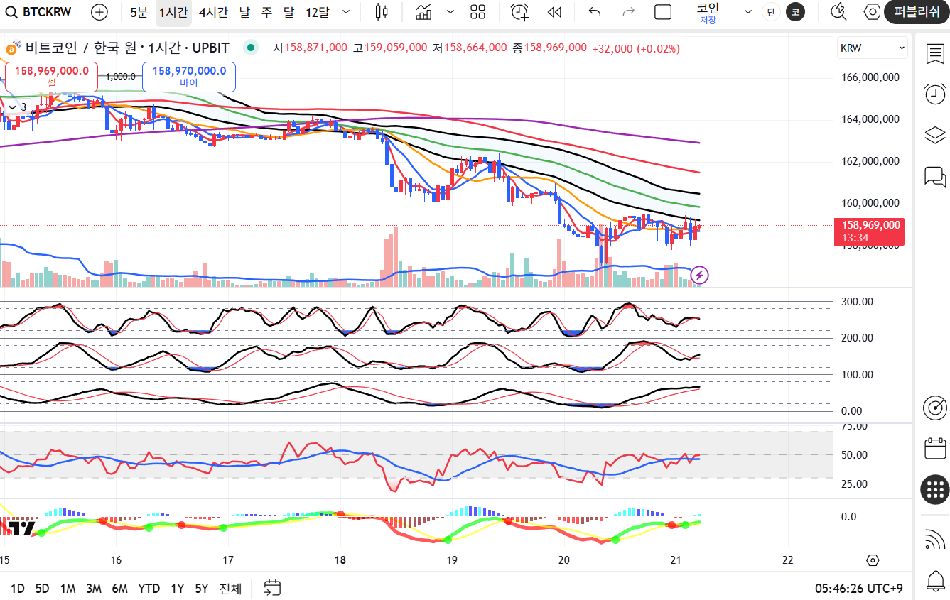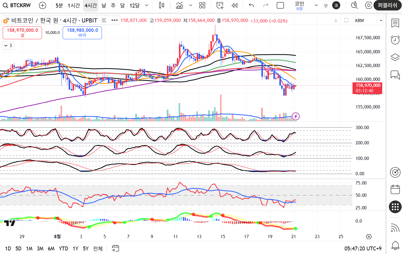 👉 해석: 중기 하락세가 이어지고 있으며, 단기 반등이 시도되더라도 160,500,000원 ~ 161,000,000원 돌파 여부가 중요합니다.