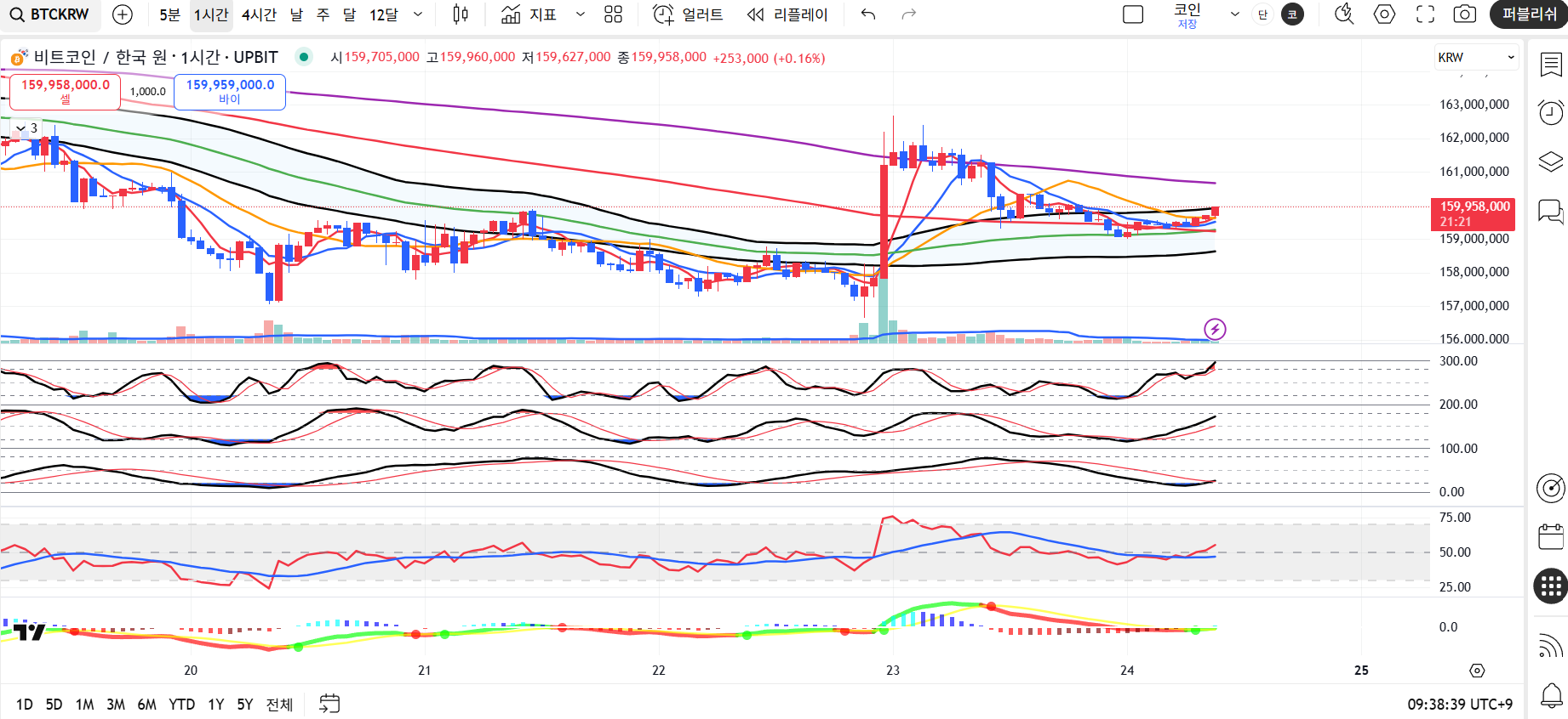 • 중기(4H): 158.5만 원 지지가 유지된다면 저점 매수 가능성. 다만, 161.5만 원 이상 돌파 전까지는 신중한 접근 필요.