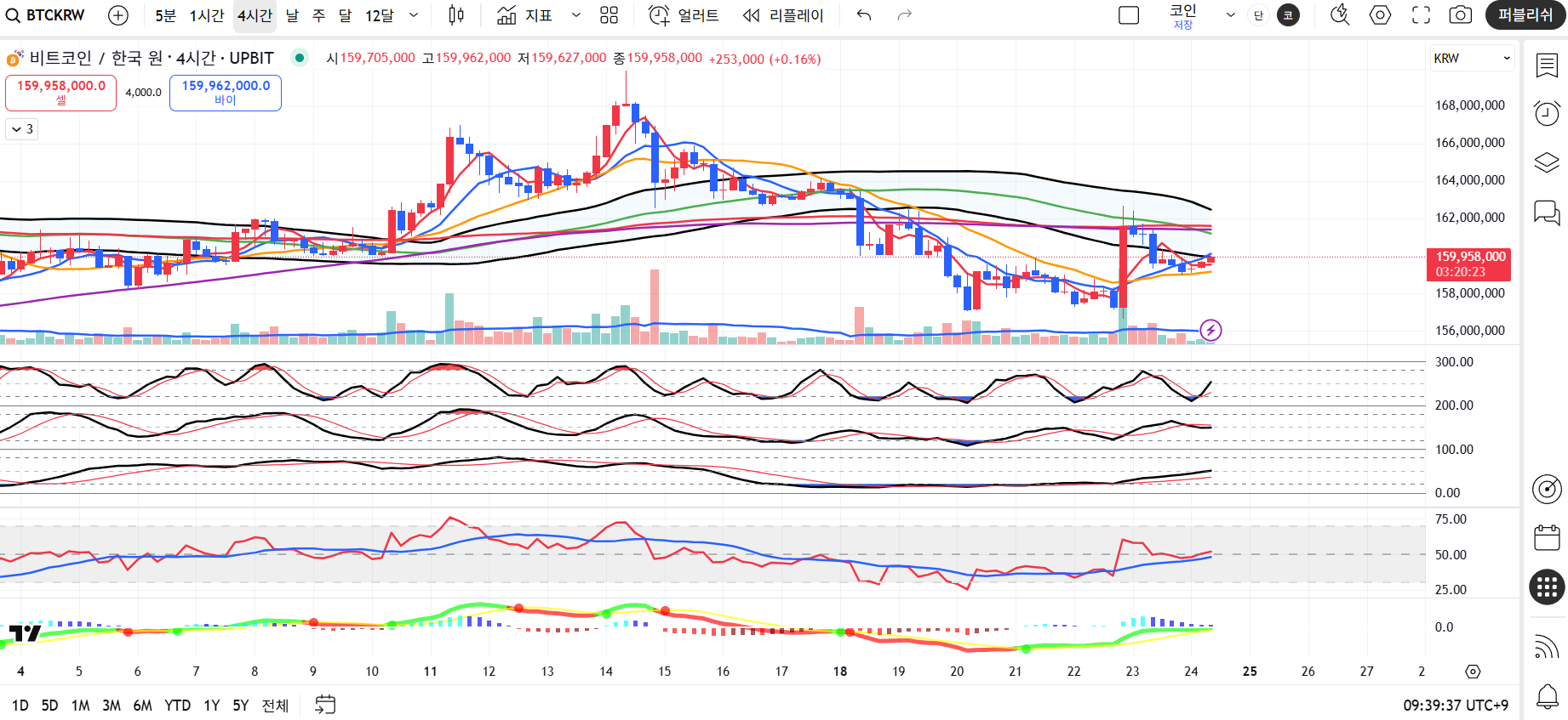 - 중기(4H): 158.5만 원 지지가 유지된다면 저점 매수 가능성. 다만, 161.5만 원 이상 돌파 전까지는 신중한 접근 필요.