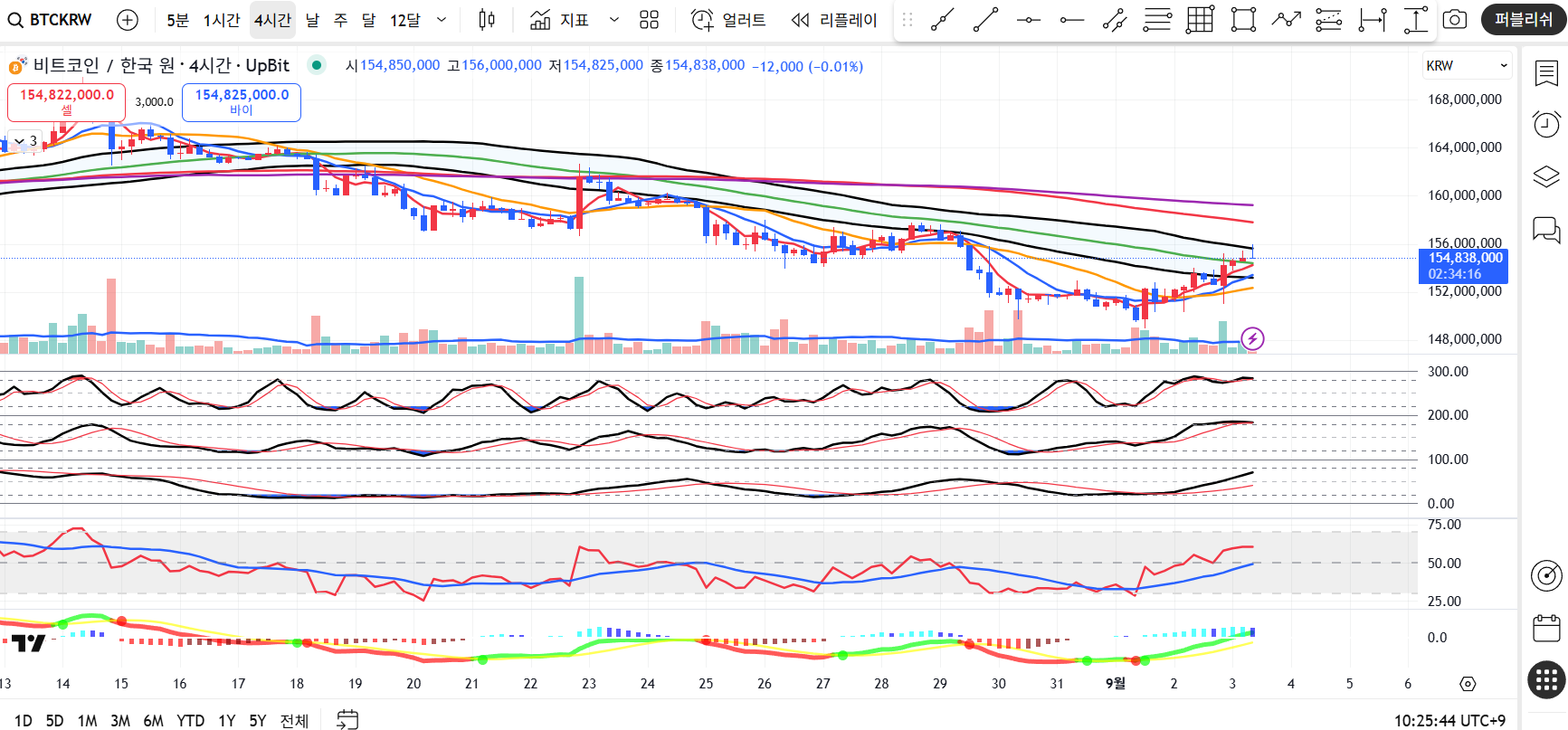 👉 해석: 4시간봉은 단기 반등에도 불구하고 중기 하락 추세선이 유효합니다. 156만 원 돌파 시 강한 숏커버링이 나올 수 있으나, 하방으로는 152만 원이 핵심 지지선으로 작용합니다.