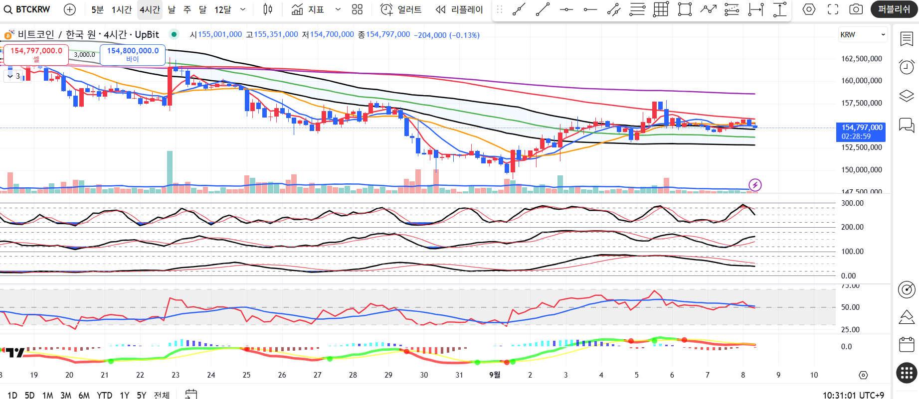 • 지지선 이탈 시 : 154,700,000원 이탈 시 재차 리스크 관리 필요 (손절 또는 리스크 조정)