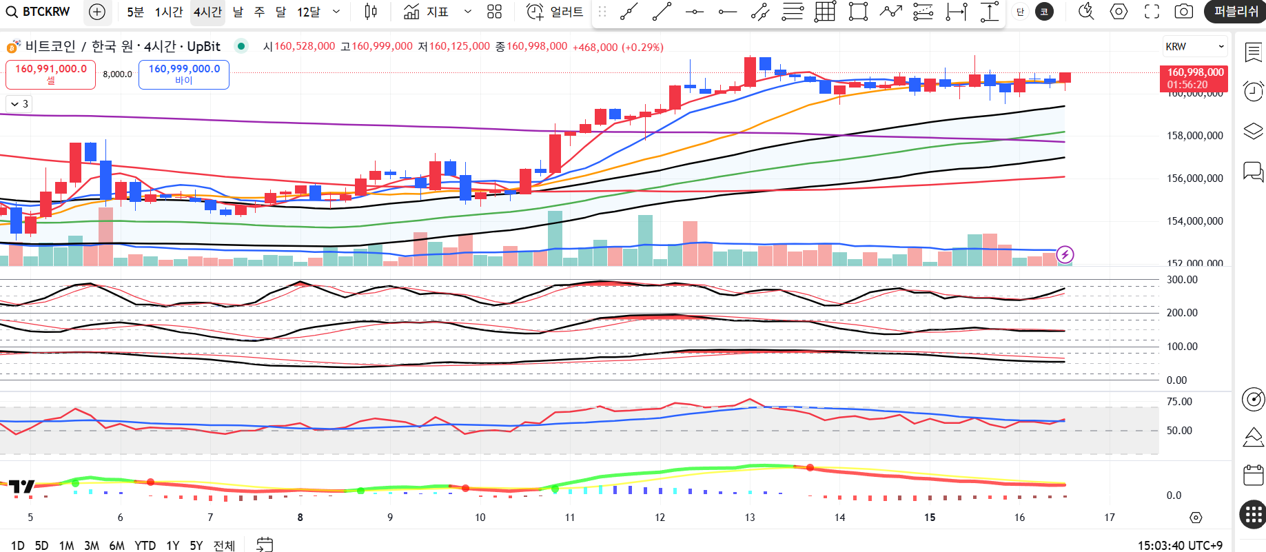 👉 4시간봉은 160,000,000원대 지지 확보 후 추가 상승 여력을 남겨둔 흐름입니다.
